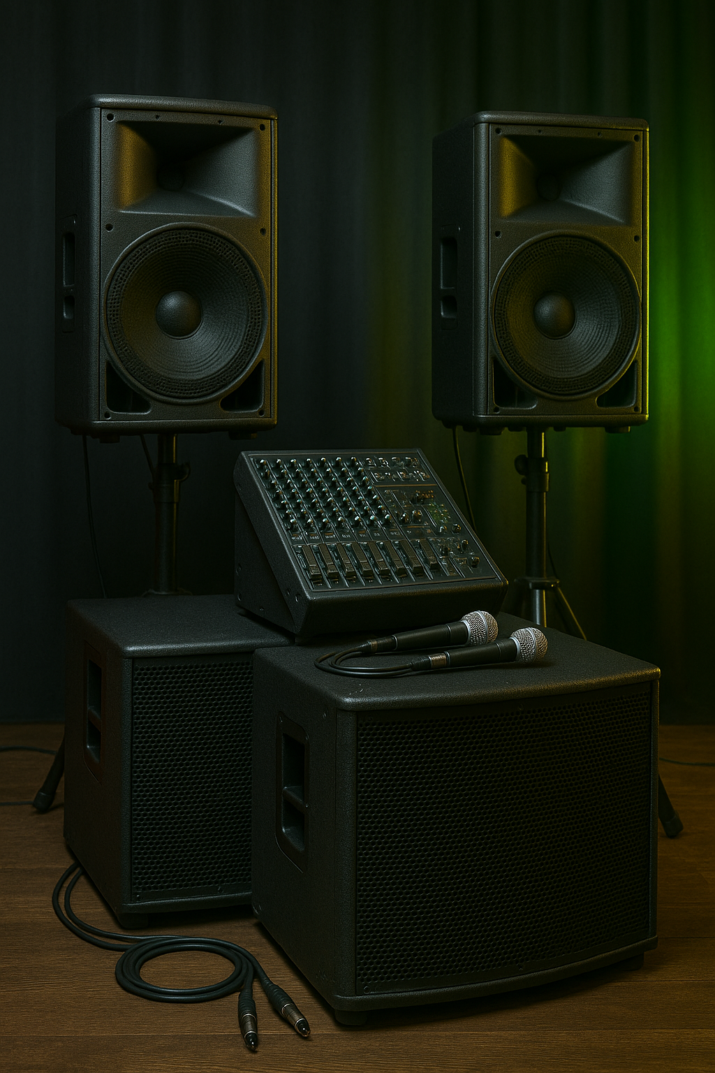Professionelle Tonanlagen, Lichttechnik, Traversensysteme, Mischpulte, Mikrofone und weiteres Zubehör. Eine Übersicht finden Sie auf unserer Seite „Equipment“.